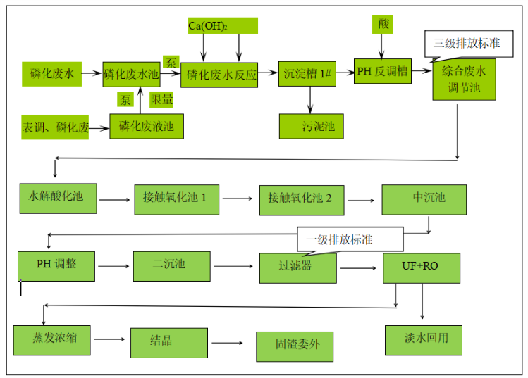1、根據產線大小和廢水產生量,只處理清洗廢水,其他廢水委托第三方處置,如接受三級排放標準,一般采用如下工藝:
